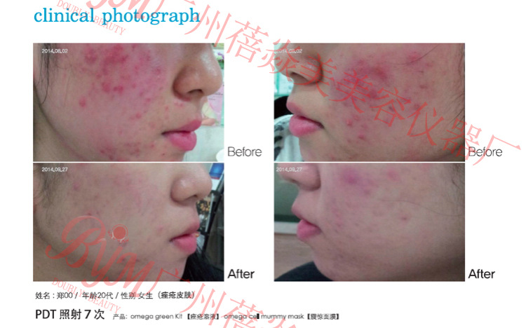 OMEGA LIGHT是使用于带状疱疹,特应性皮炎、皮肤再生、杀灭痤疮杆菌以及缓解疼痛等对各种皮肤问题。其中最有效的临床是操作伤口。照射LED光源对带状疱疹者时发炎的恢复速度快于20%,疼痛也减少于30%以上。640nm的Red light LED光源是促进胶原蛋白和细胞中能源物质的线粒体的活性化帮助皮肤再生,使正常化血液循环,舒缓疼痛来抑制皮炎。